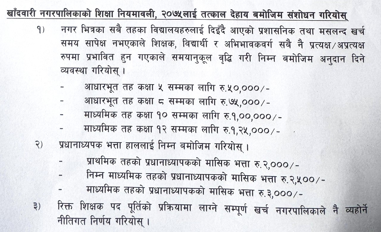भण्डारीले पेश गरेको मागपत्रमा शिक्षा, सार्वजनिक खरिद, विकास आयोजना, कृषि, स्वास्थ्य तथा सुशासनका विषय समेटिएका छन्। उनले नगरभित्रका विद्यालयलाई दिइने अनुदान वृद्धि, प्रधानाध्यापक भत्ता बढाउने तथा शिक्षक पदपूर्ति खर्च नगरपालिकाले व्यहोर्ने व्यवस्था गर्न माग गरेका छन्। यस्तै, संस्थागत विद्यालयहरूले लिँदै आएको शुल्कमा नियन्त्रण गर्न सरोकारवालासँग छलफल गरी शुल्कको सीमा तोक्नुपर्ने उल्लेख गरेका छन्। नगरको शिक्षा नियमावली, २०७५ तत्काल संशोधन गर्नुपर्ने माग गर्दै विद्यालयहरूलाई दिइने प्रशासनिक तथा मसलन्द खर्च समयानुकूल वृद्धि गर्नुपर्ने बताएका छन्।