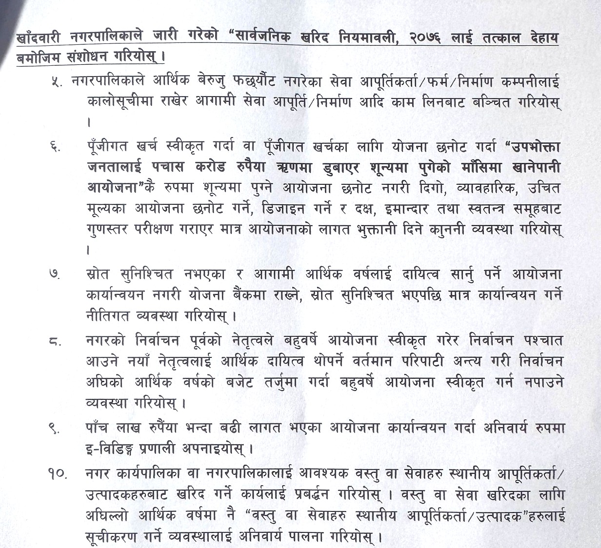 त्यसैगरी, स्रोत सुनिश्चित नभएका आयोजना कार्यान्वयन नगर्न, बहुवर्षे योजनामार्फत नयाँ नेतृत्वमाथि आर्थिक दायित्व थोपर्ने परिपाटी अन्त्य गर्नुपर्ने उल्लेख गरेका छन्। भण्डारीले स्थानीय कृषि उत्पादनको बजार सुनिश्चित गर्न नगरपालिका आफैं संलग्न हुनुपर्ने, विद्युत् आयोजनाबाट प्राप्त हुने सामाजिक उत्तरदायित्व रकम प्रभावित क्षेत्रमा खर्च गर्नुपर्ने माग गरेका छन्।